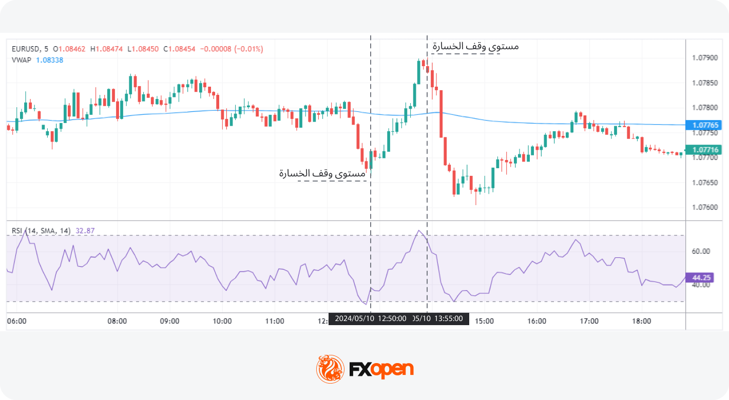 · وعلى العكس، يُنظَر عادةً في فتح صفقة شراء (طويلة) عندما يعاود مُؤشِّر القوّة النسبية (RSI) الارتفاع فوق القيمة 30 (ممَّا يُشير إلى تراجع الزخم الهبوطي بعد بلوغ حالة التشبُّع البيعي واحتمال بدء حركة تصحيحية صعودية)، تزامنًا مع كون السعر أدنى من خط المتوسِّط السعري المرجَّح بالحجم (VWAP) (في إشارةٍ إلى تداول السعر دون متوسطه المرجَّح بحجم التداول خلال اليوم، ممَّا قد يزيد من احتمال عودته صعودًا نحو هذا المتوسط وفق مبدأ «عودة الأسعار إلى متوسطها»).