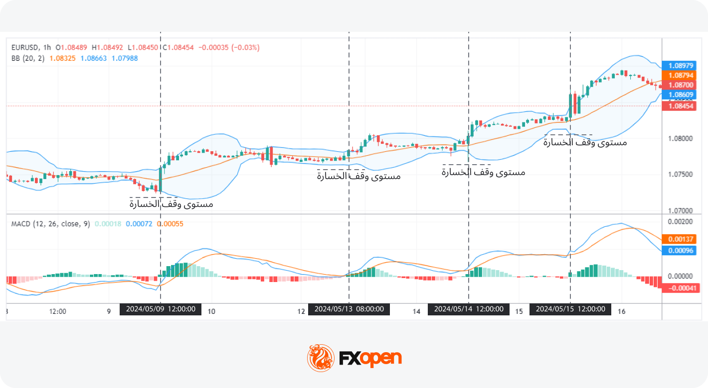 · يمكن تعيين مستويات وقف الخسارة خارج الحد المقابل لنطاق مؤشِّر حدود بولنجر (أي أسفل الحد السفلي للنطاق في حالة الاختراق الصعودي، وأعلى الحد العلوي للنطاق في حالة الكسر الهبوطي).
