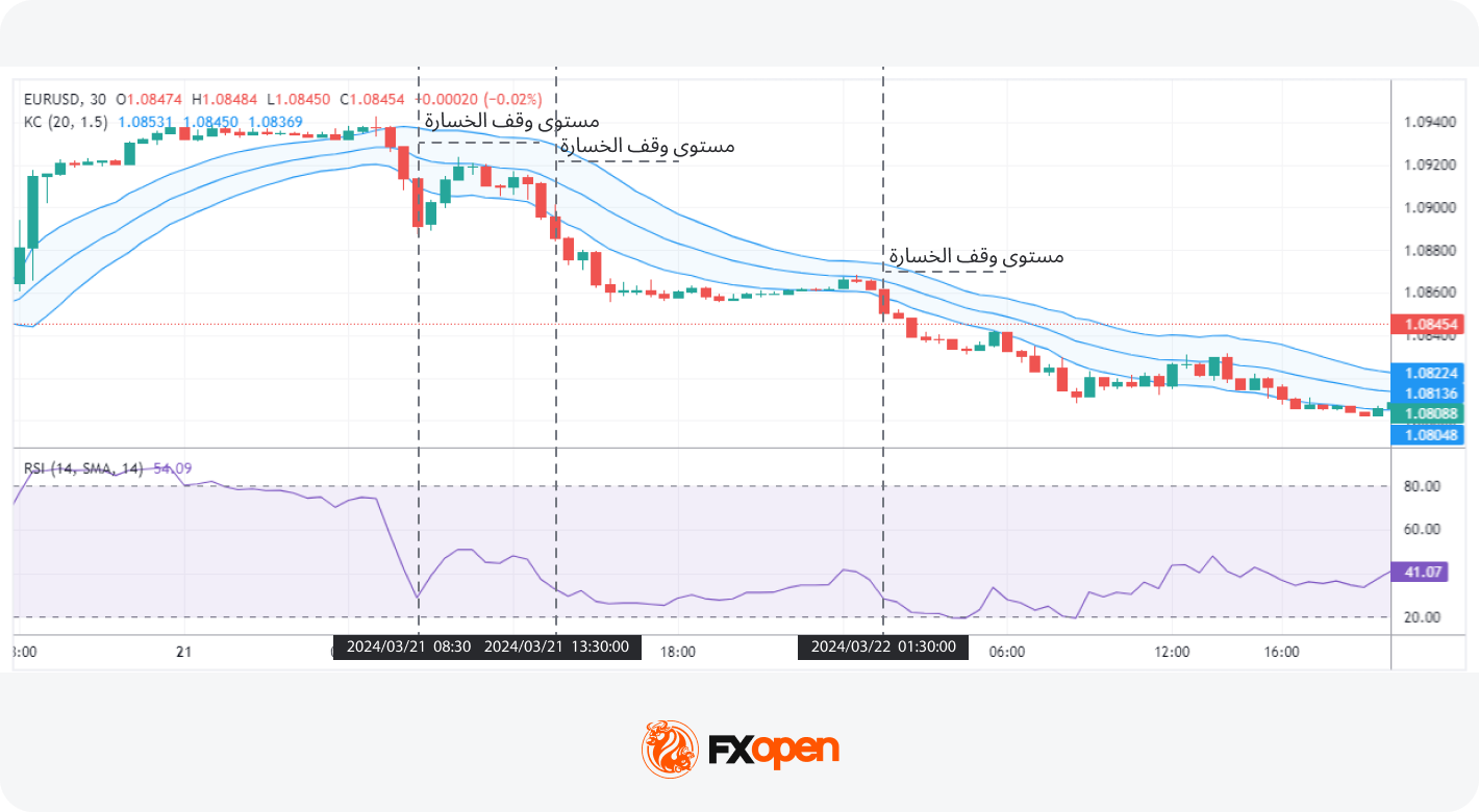 · يمكن تعيين مستويات وقف الخسارة بعد الخط الأوسط لمؤشِّر قناة كيلتنر في الجهة المعاكسة للصفقة (أي أسفل هذا الخط في صفقات الشراء، أو أعلاه في صفقات البيع).