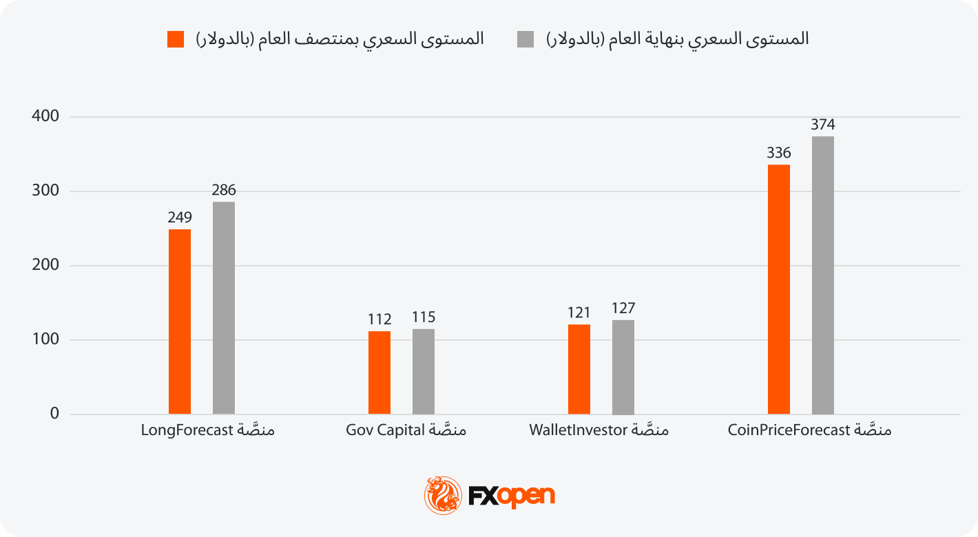 · أكثر التوقُّعات تفاؤلًا لنهاية عام 2027: 374 دولار (وفقًا لمنصَّة CoinPriceForecast)