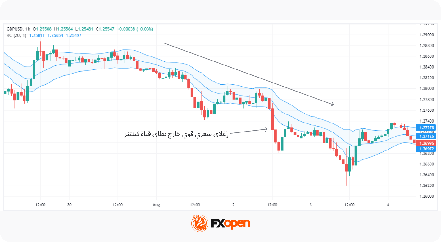 ● نقاط الدخول والخروج: يُعدُّ تحديد نقاط الدخول والخروج بدقَّة أمرًا بالغ الأهمية. وغالبًا ما يدخل المتداولون الصفقة بعد حدوث تصحيح ضمن الاتجاه، ويخرجون منها عند بلوغ مستوى ربح مُحدَّد مسبقًا أو عند ظهور إشارات تدلُّ على انعكاس الاتجاه. ويُمكن لمقاييس التقلُّب مثل مؤشِّر قنوات كيلتنر، أن تُساعد في تحسين دقَّة هذه القرارات.
