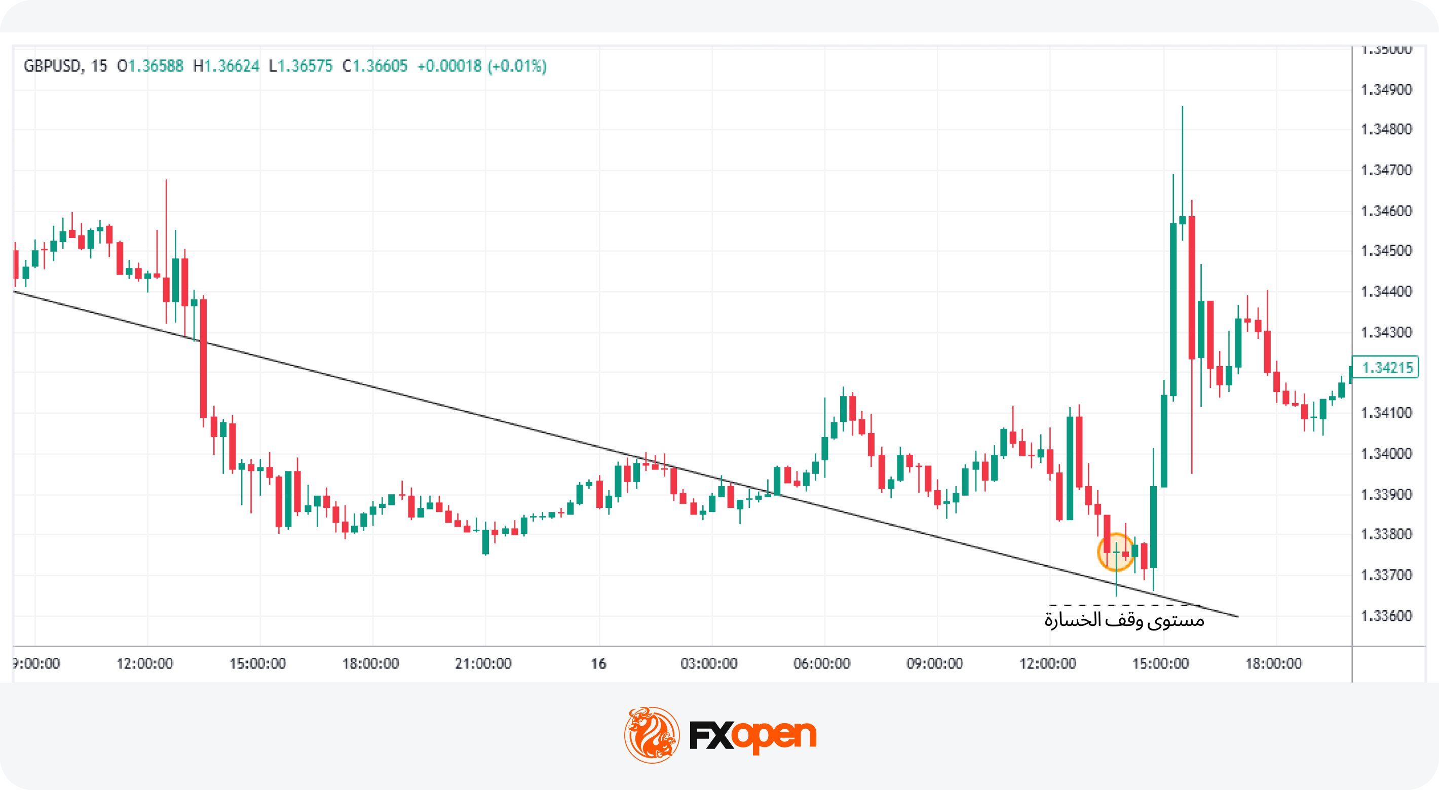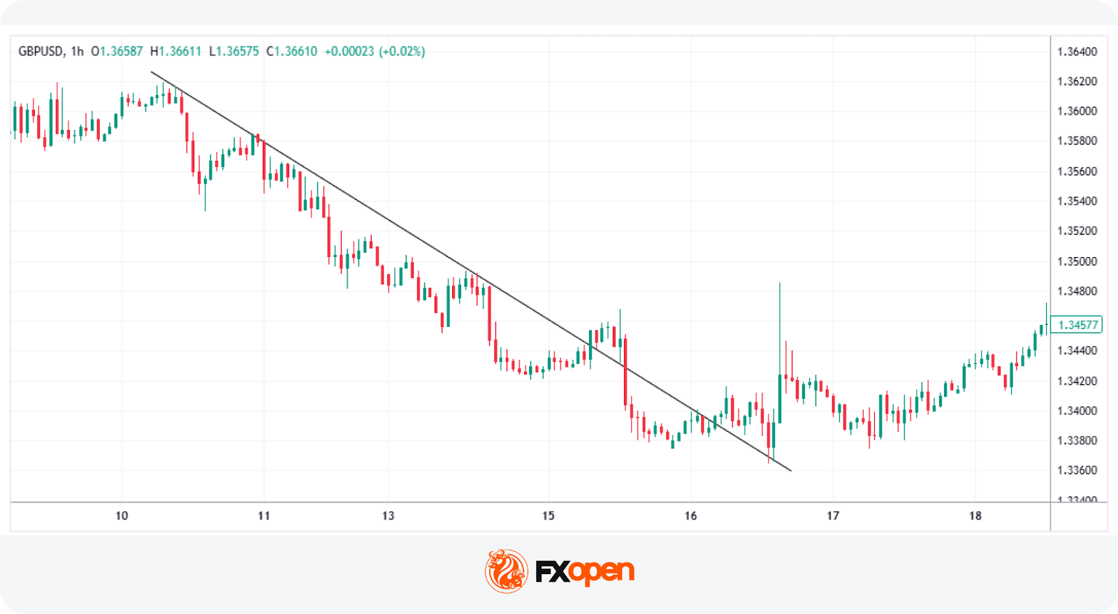 في المثال أعلاه، نلاحظ حركة سعر زوج الجنيه الإسترليني/الدولار الأمريكي (GBP/USD) على مخطَّط الساعة الواحدة ضمن اتجاه سائد هابط استمرَّ لعدَّة أيَّام، وكان خط الاتجاه الهابط يشكِّل الحدّ العلوي للحركة السعرية خلال هذه الفترة.