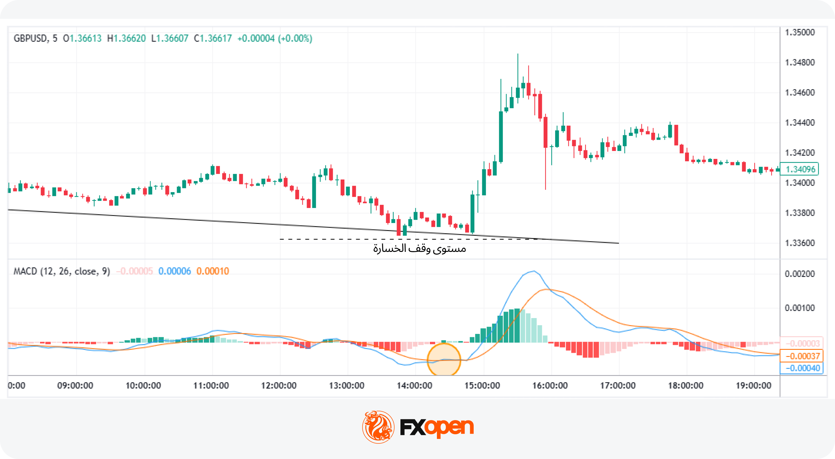 وإذا اختار المتداول نهجًا أكثر تحفُّظًا (أي فضَّل انتظار تأكيد إضافي قبل دخول الصفقة بدل الاعتماد على إشارة واحدة)، فيمكنه الانتقال إلى إطار 5 دقائق الزمني، حيث يظهِر مؤشِّر تقارب وتباعد المتوسطات المُتحرِّكة (MACD) تقاطعًا صعوديًا (تقاطع خط الماكد مع خط الإشارة صعودًا في إشارةٍ إلى تحوُّل الزخم لصالح المشترين)، ممَّا يدعم إشارة شمعة البن بار ويضيف مزيدًا من عوامل التوافق الفني.