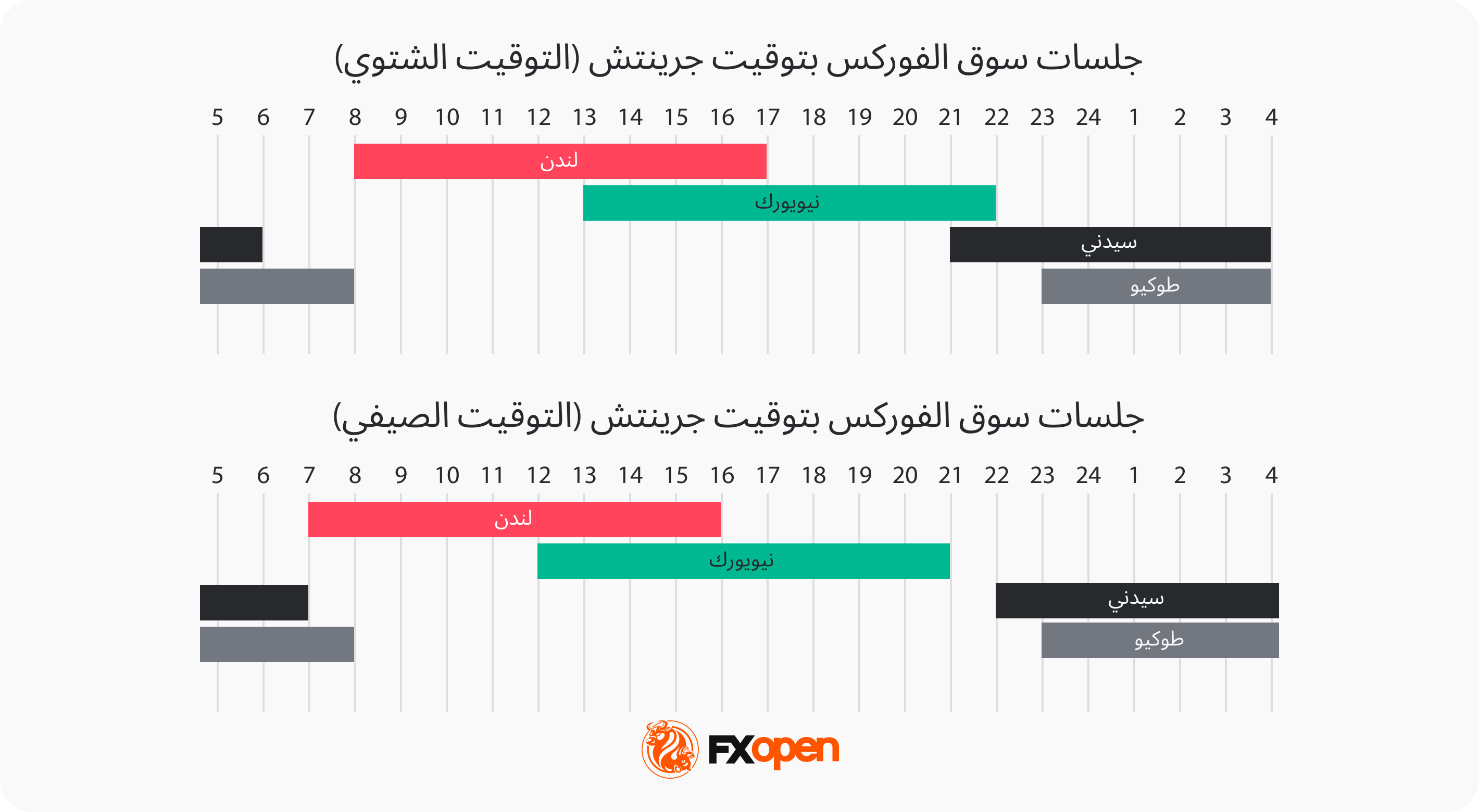 مع ملاحظة أنَّه خلال التوقيت الصيفي البريطاني (BST)، يتمُّ تقديم بعض هذه الأوقات ساعةً واحدة إلى الأمام. وفي هذا الصدد، يُمكنك التفضُّل بزيارة منصَّة التداوُل TickTrader من FXOpen واختيار «ساعات عمل الأسواق العالمية» لمشاهدة الوقت الحالي في كل دولة وبناء استراتيجيتك بما يتناسب مع تلك الساعات.