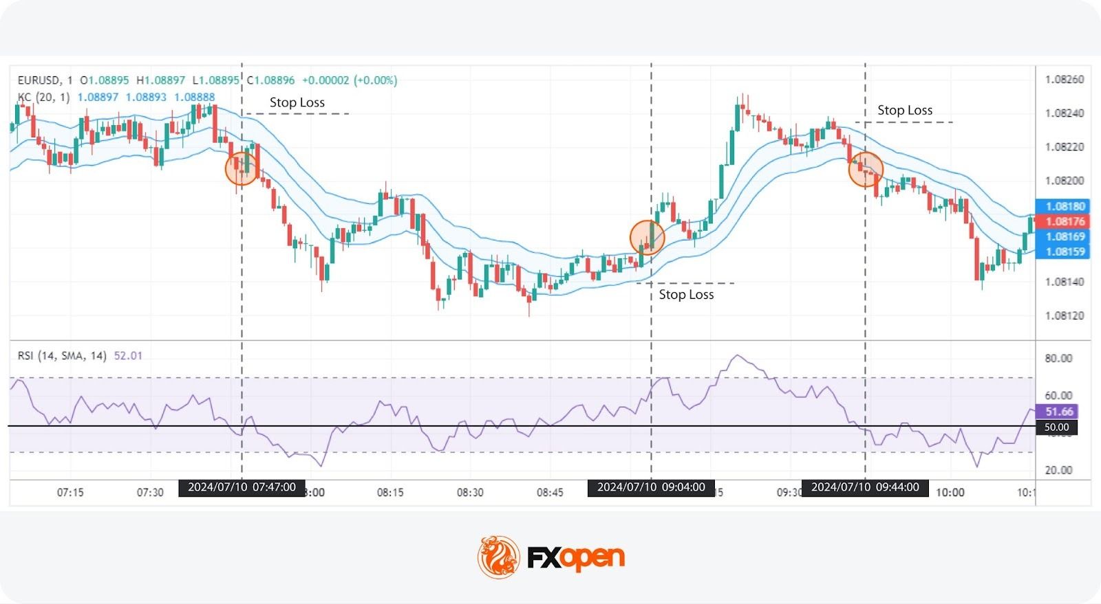 - Stop losses might be set beyond the opposite side of the Keltner Channel.