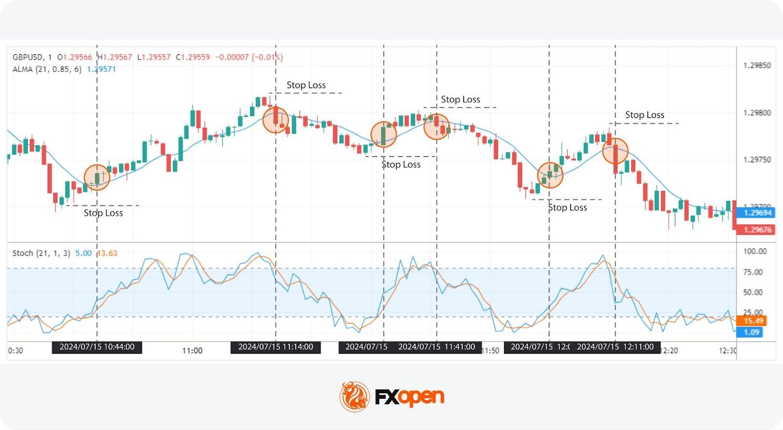 Combining ALMA with the Stochastic Oscillator allows traders to identify potential reversals in trends. ALMA provides a smoothed view of the price trend, while the Stochastic Oscillator offers momentum-based signals that are expected to help confirm the strength of a move.