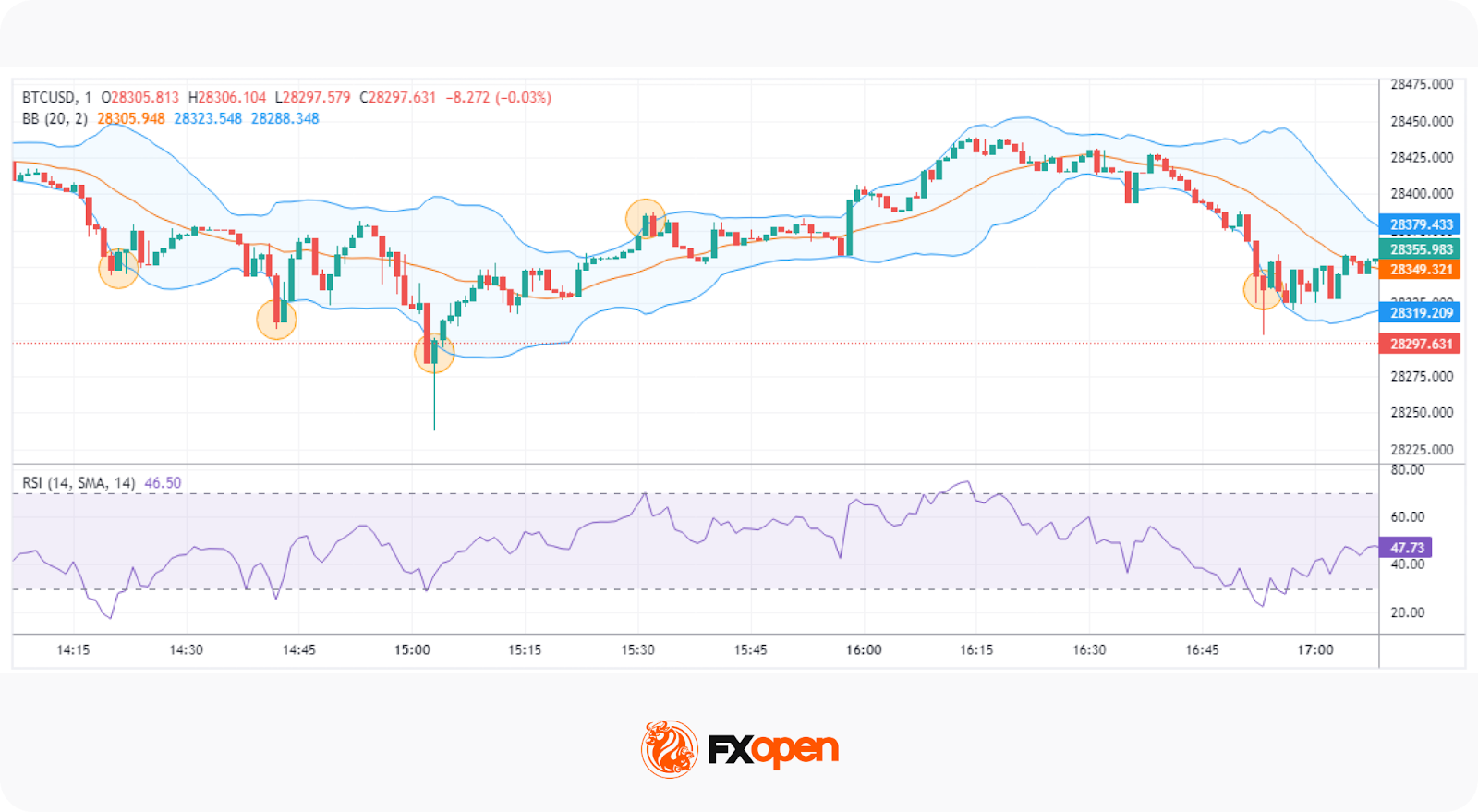 Some scalpers rely heavily on technical indicators to determine entries and exits. One popular combination is the relative strength index (RSI) and Bollinger Bands.
