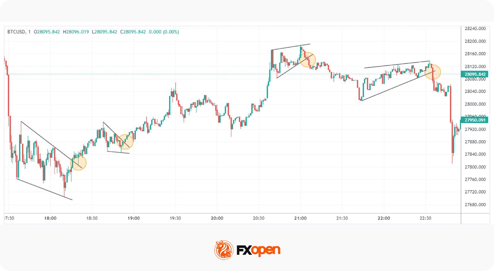 Chart patterns can be a powerful tool for scalping, helping traders to identify potential trend continuations and reversals. While there are many different chart patterns out there, some traders stick to just one or two to avoid confusion. We’ll use rising and falling wedges in this example, as they often lead to strong moves.