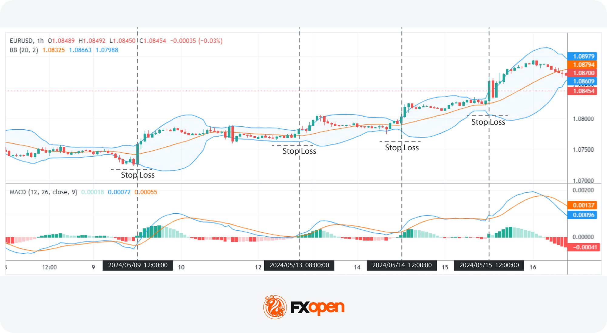 - The MACD is used to confirm the breakout direction. Traders typically watch for the MACD signal line to cross above the MACD line for a bullish breakout or below for a bearish breakout.