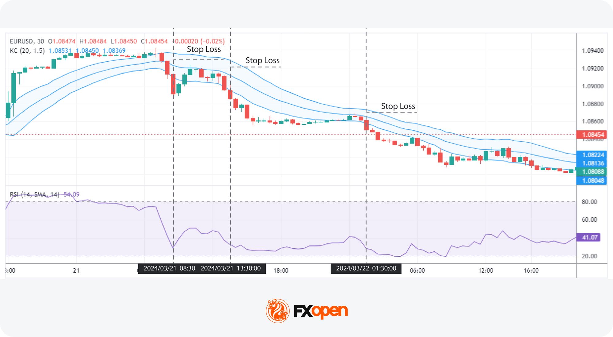 - Stop losses might be set beyond the midpoint of the Keltner Channel.