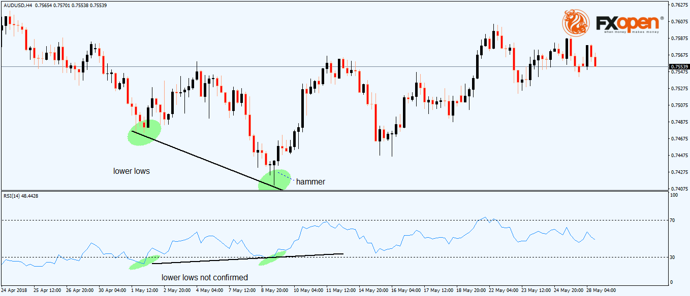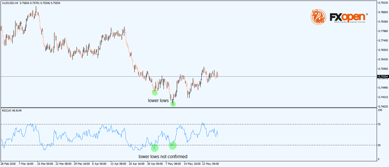 While the pair made two consecutive lower lows, the RSI failed to confirm the second one. This is enough for a divergence and, in this case, this is called a bullish divergence because it forms at the end of a bearish trend.