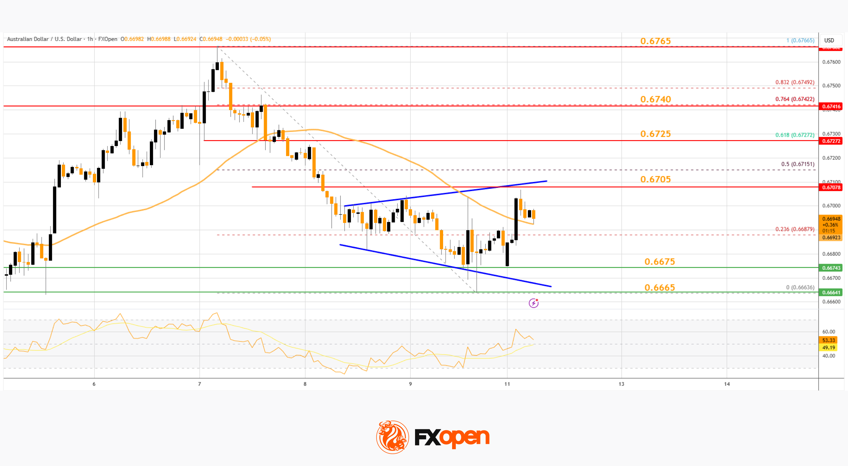 · There is an expanding triangle forming with resistance at 0.6705 on the hourly chart of AUD/USD at FXOpen.