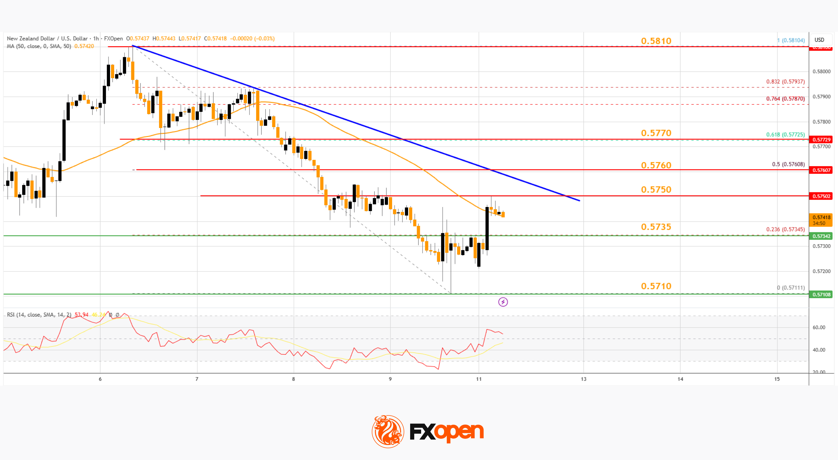· There is a key bearish trend line forming with resistance at 0.5750 on the hourly chart of NZD/USD at FXOpen.