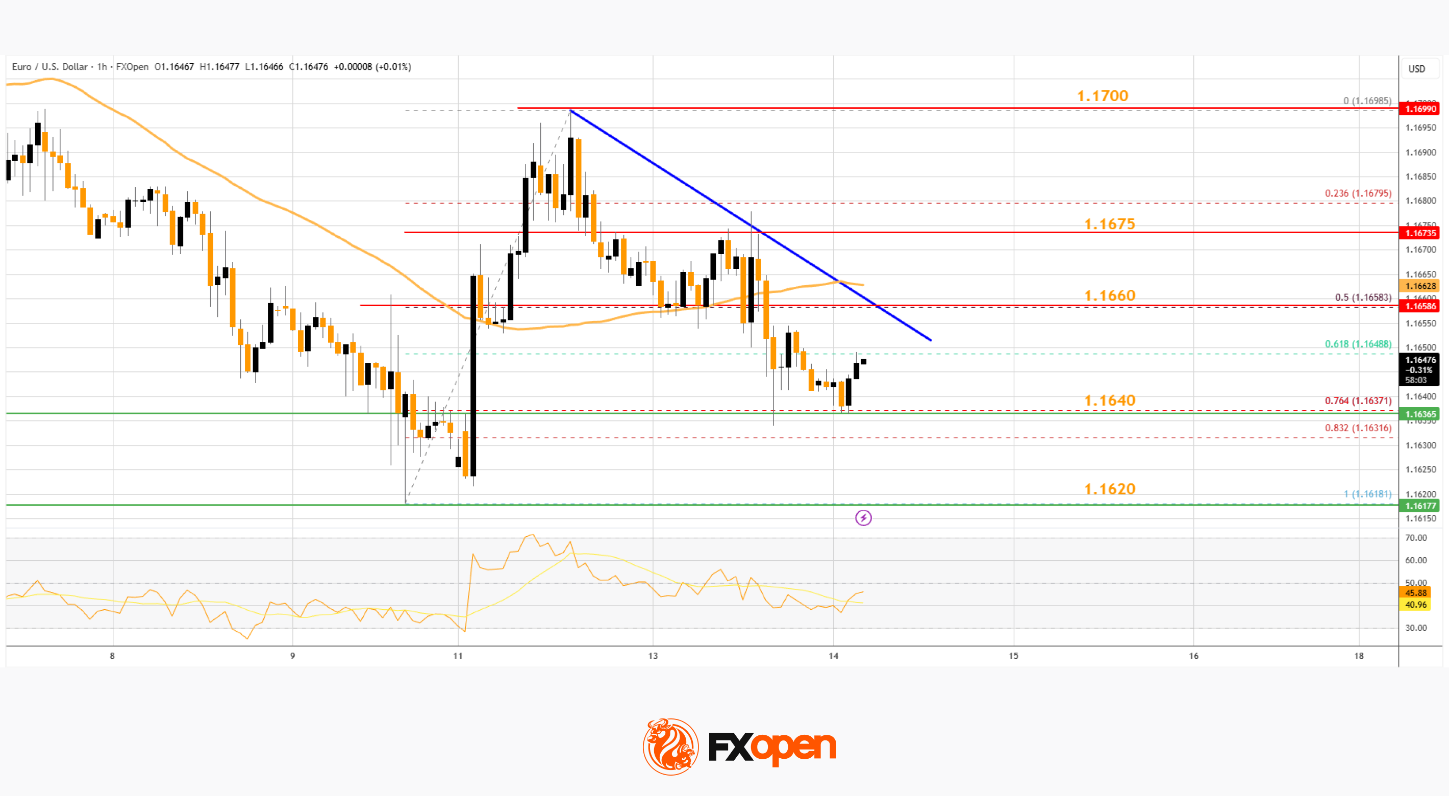· There is a bearish trend line forming with resistance at 1.1660 on the hourly chart of EUR/USD at FXOpen.