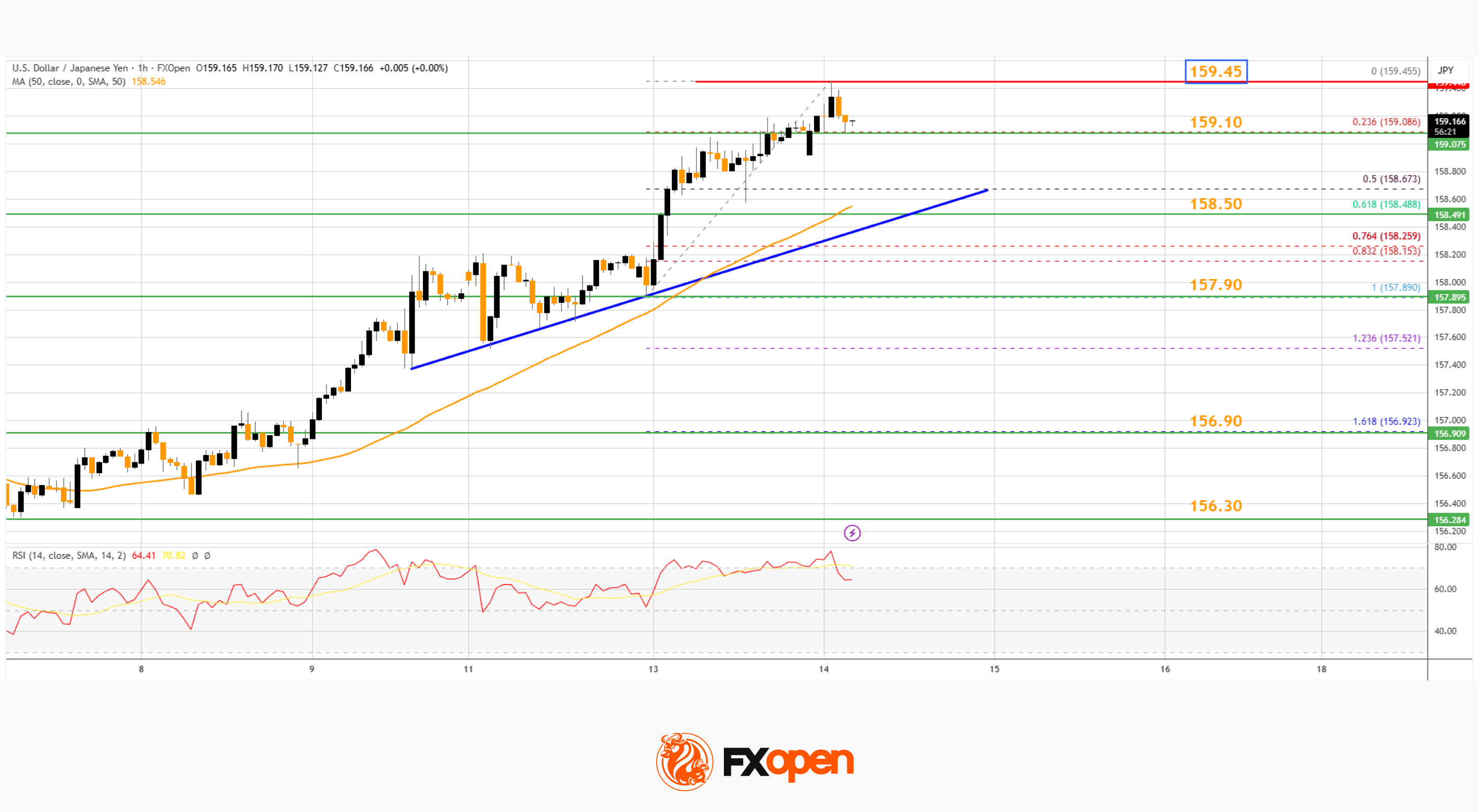 Immediate resistance on the USD/JPY chart is near 159.45. The first key hurdle sits at 159.50. If there is a close above 159.50 and the RSI moves above 75, the pair could rise toward 160.00.
