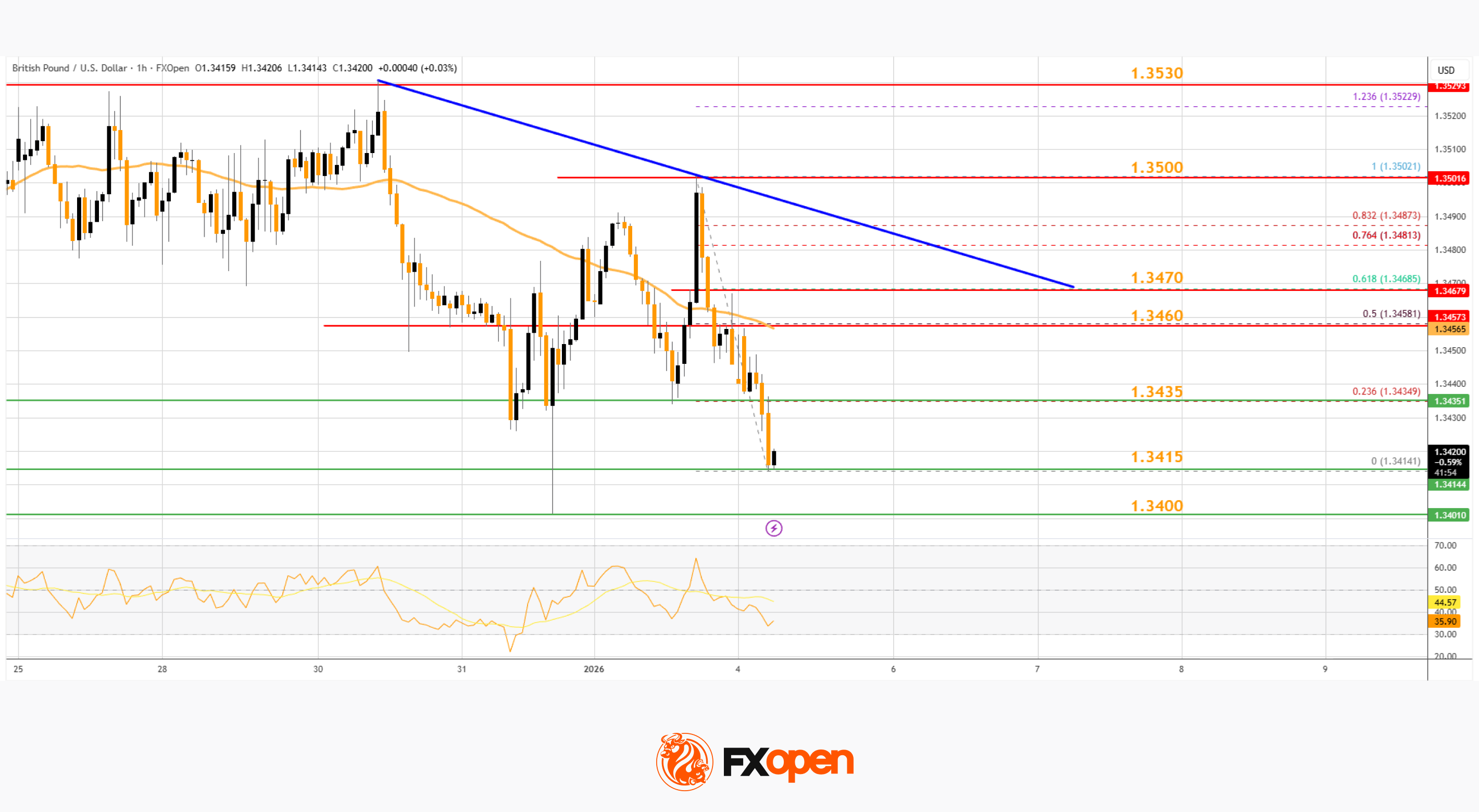 On the hourly chart of GBP/USD at FXOpen, the pair started a fresh decline after it failed to stay above 1.3500. The British Pound traded below 1.3460 to enter a short-term bearish zone against the US Dollar.