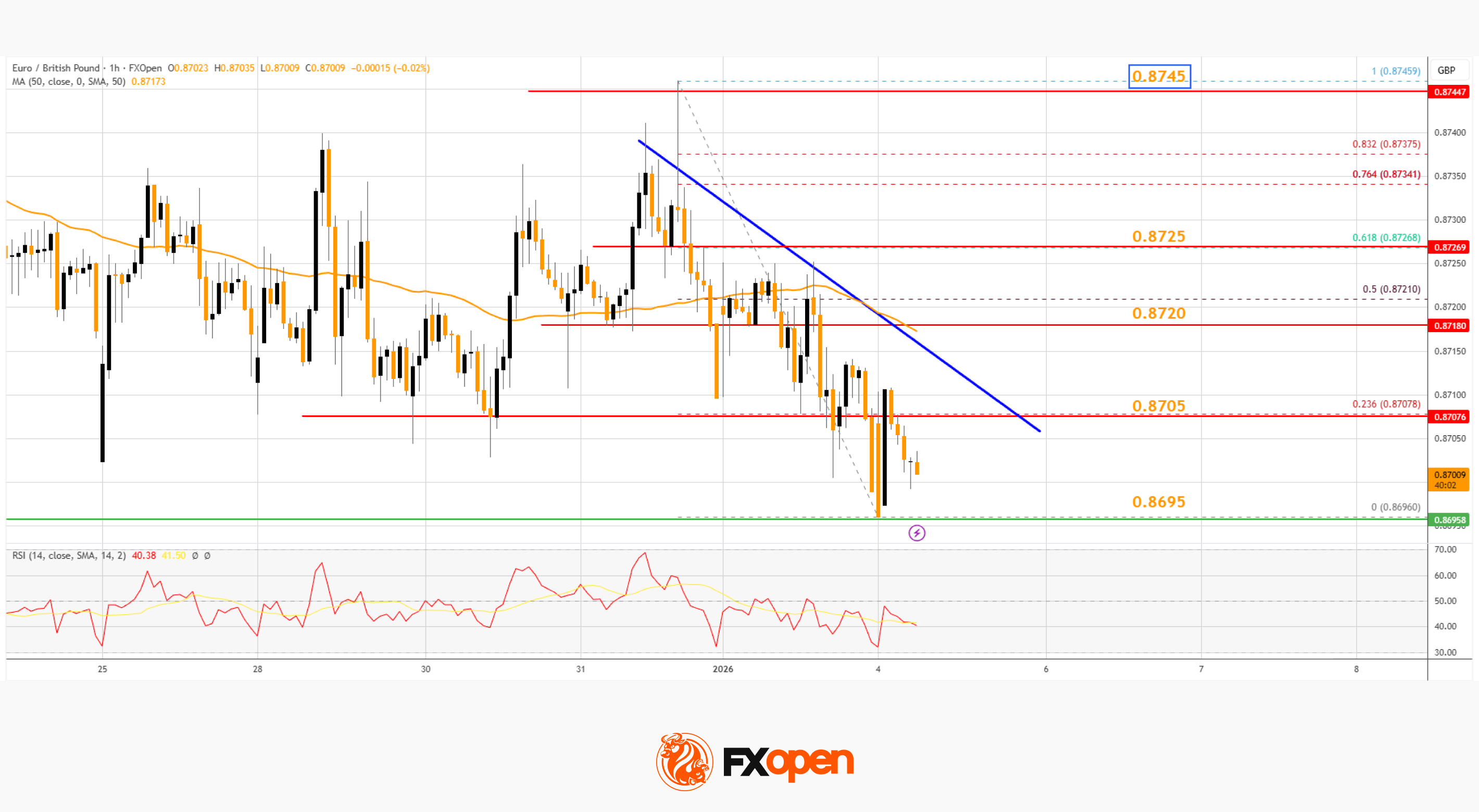 · There is a connecting bearish trend line forming with resistance at 0.8705 on the hourly chart at FXOpen.