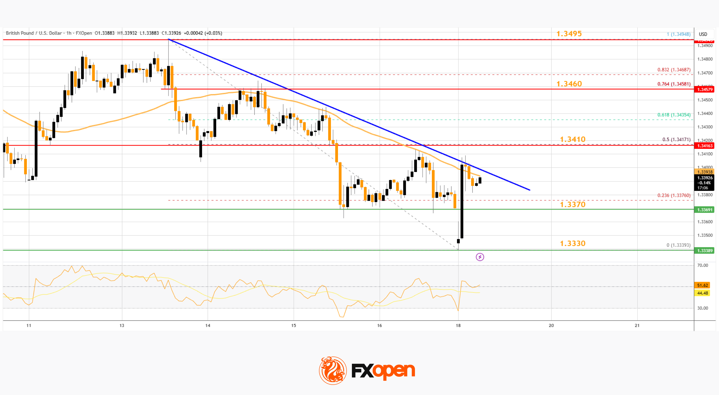 · There is a key bearish trend line forming with resistance at 1.3400 on the hourly chart of GBP/USD at FXOpen.