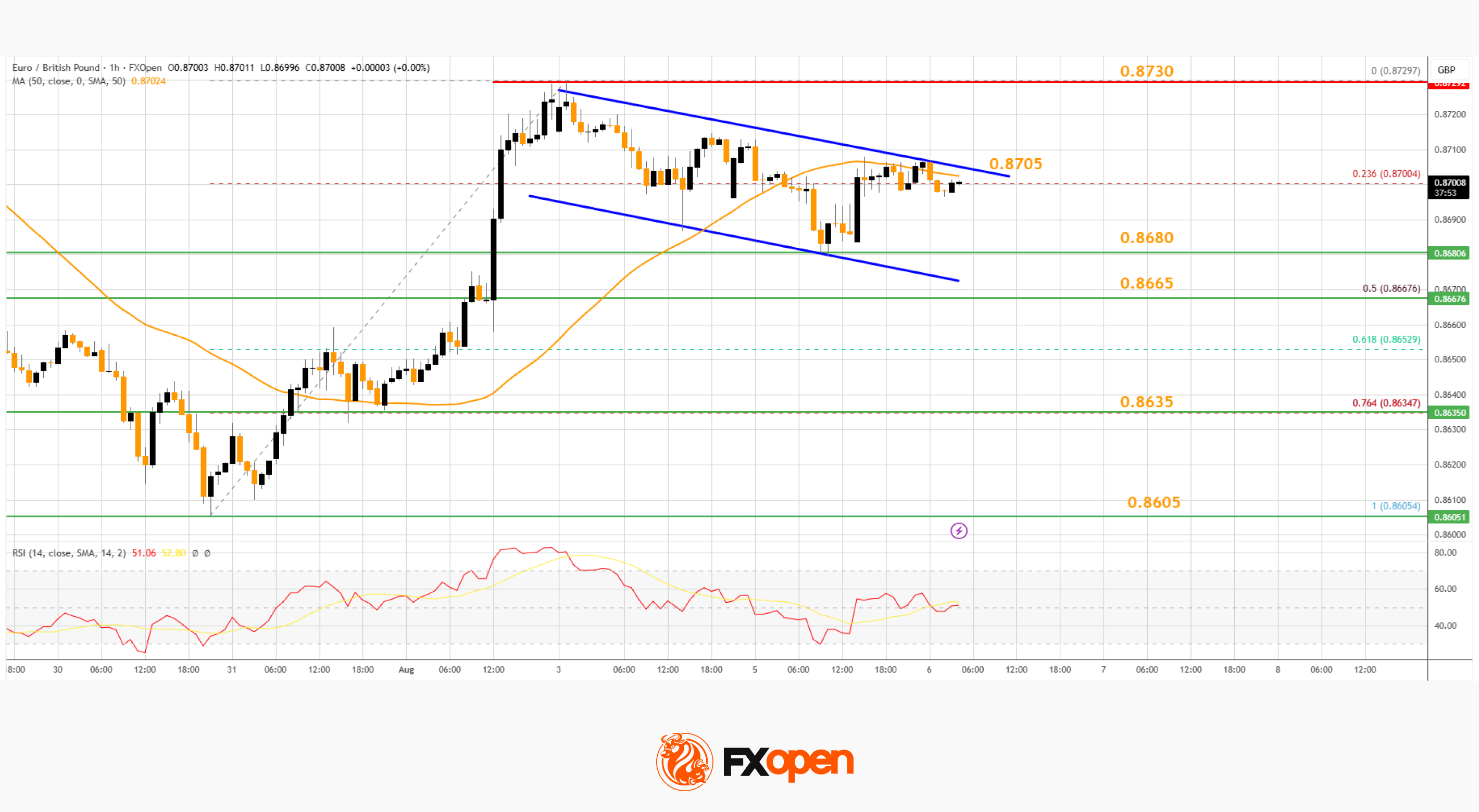 - There is a short-term declining channel forming with resistance near 0.8705 on the hourly chart at FXOpen.