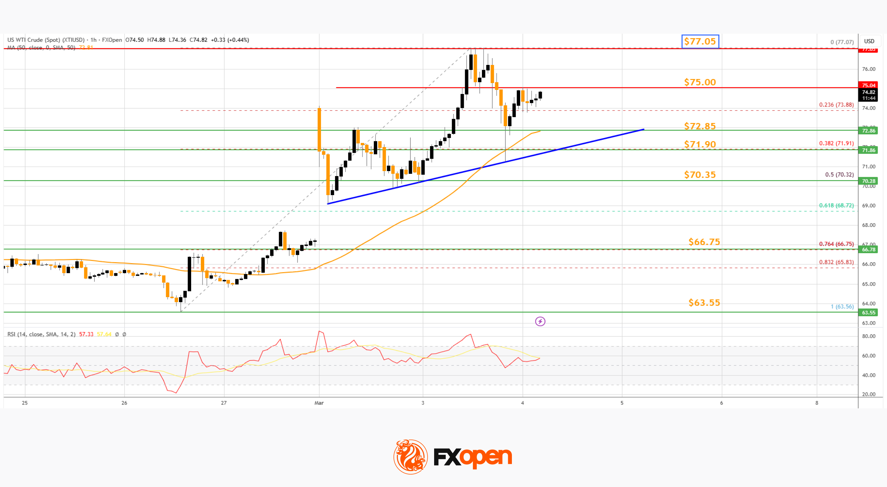 On the hourly chart of WTI Crude Oil at FXOpen, the price started a strong increase from $63.50 against the US Dollar. The price gained bullish momentum after it broke $68.00.