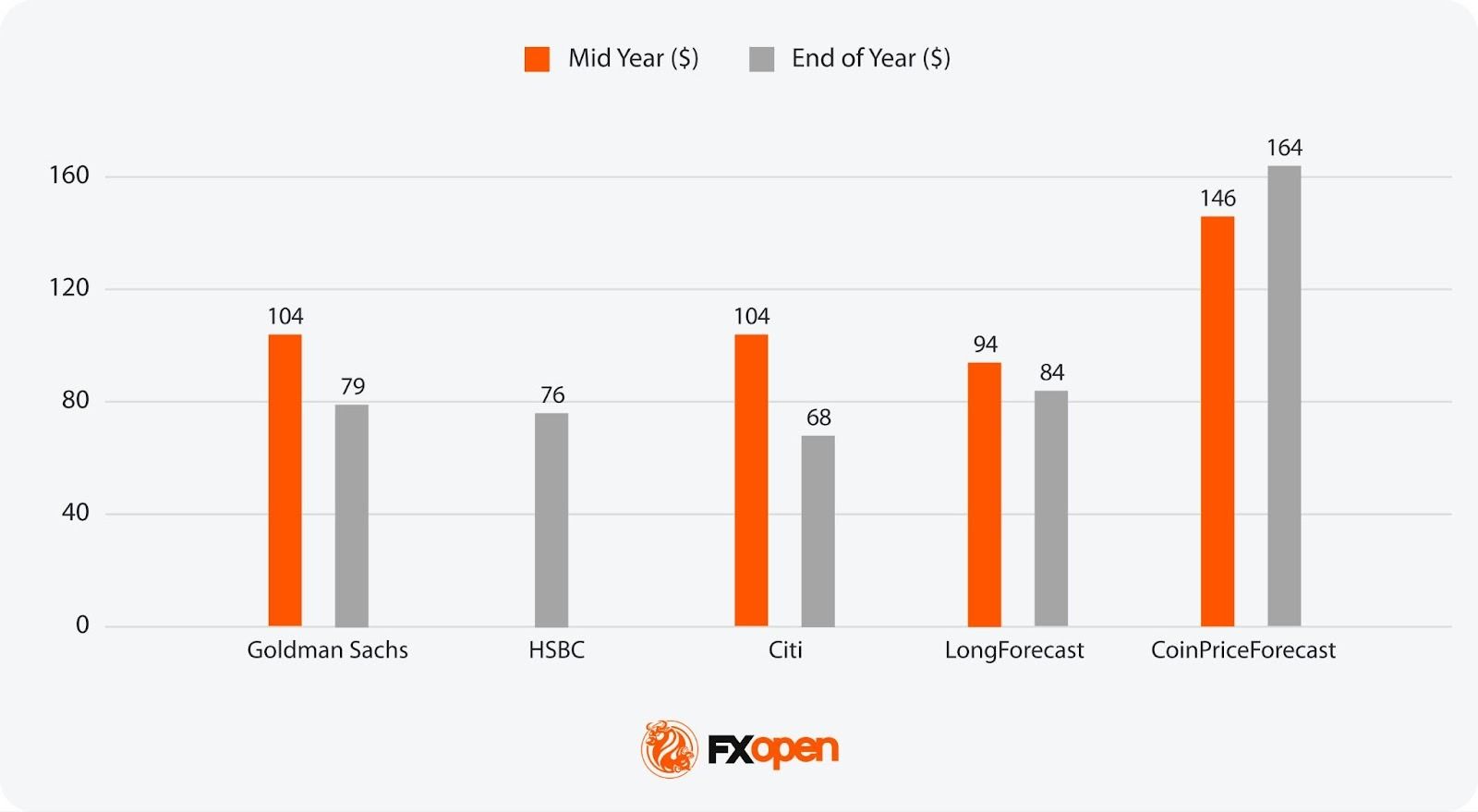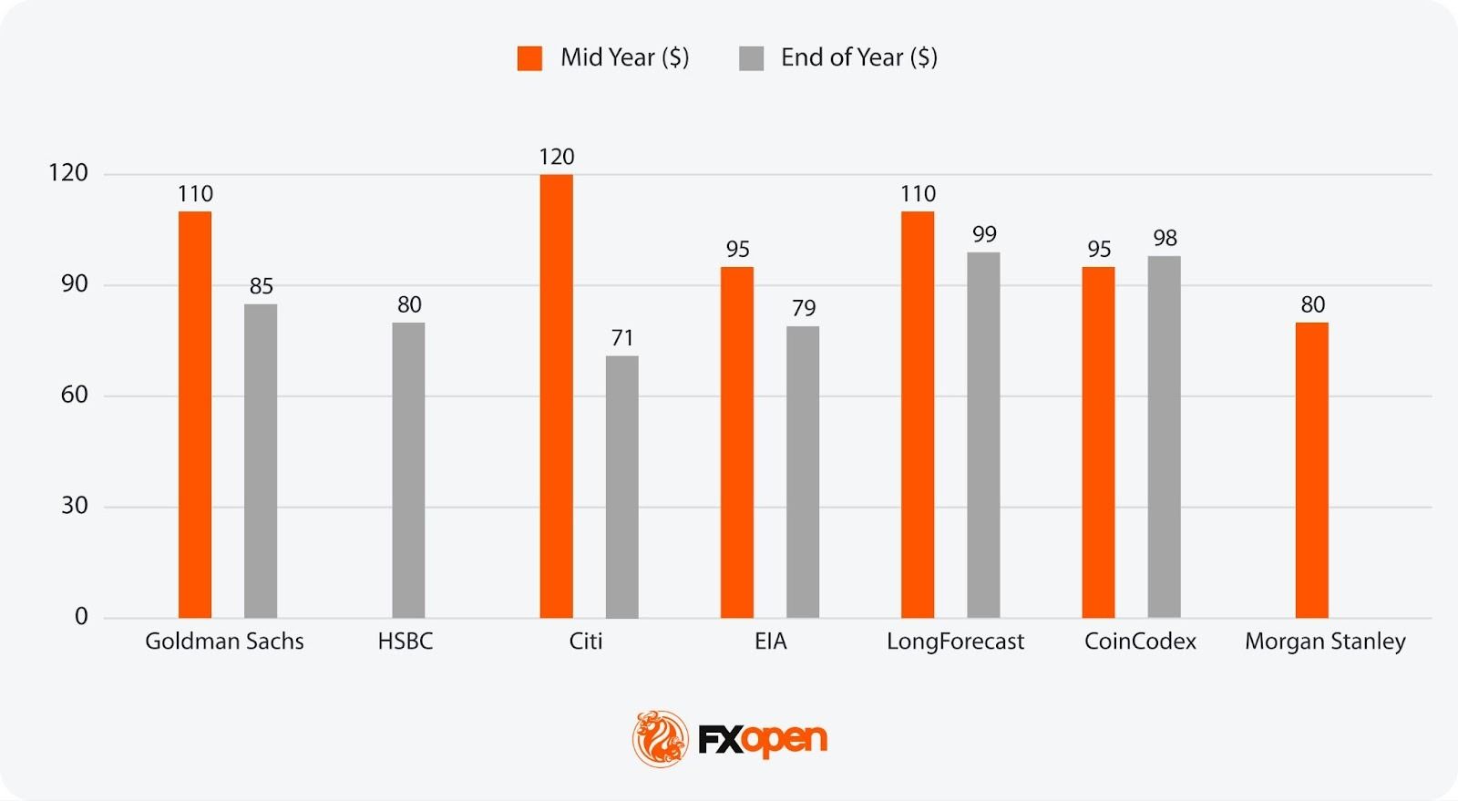 Most analytical crude oil predictions place Brent between $95 and $110 per barrel at mid-year, falling to around $71-$98 by year-end. WTI tracks a similar pattern, with mid-year ranges of $94 to $104 and end-of-year projections between $68 and $84.