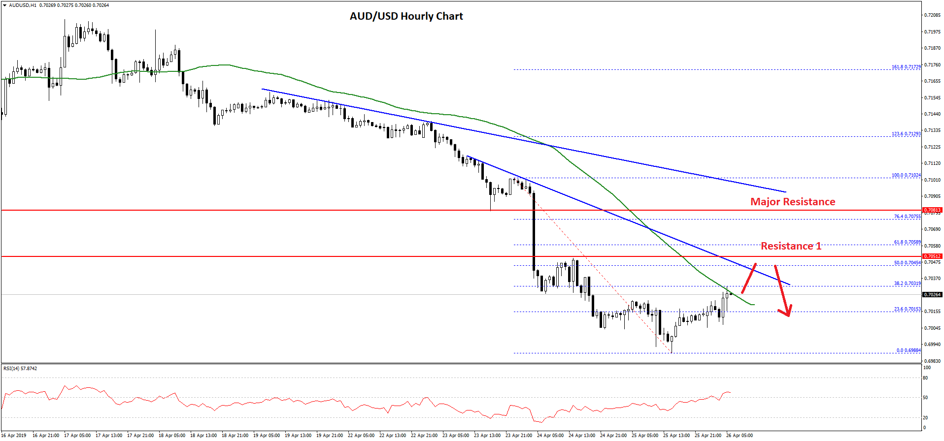- There is a major bearish trend line in place with resistance at 0.7040 on the hourly chart of AUD/USD.