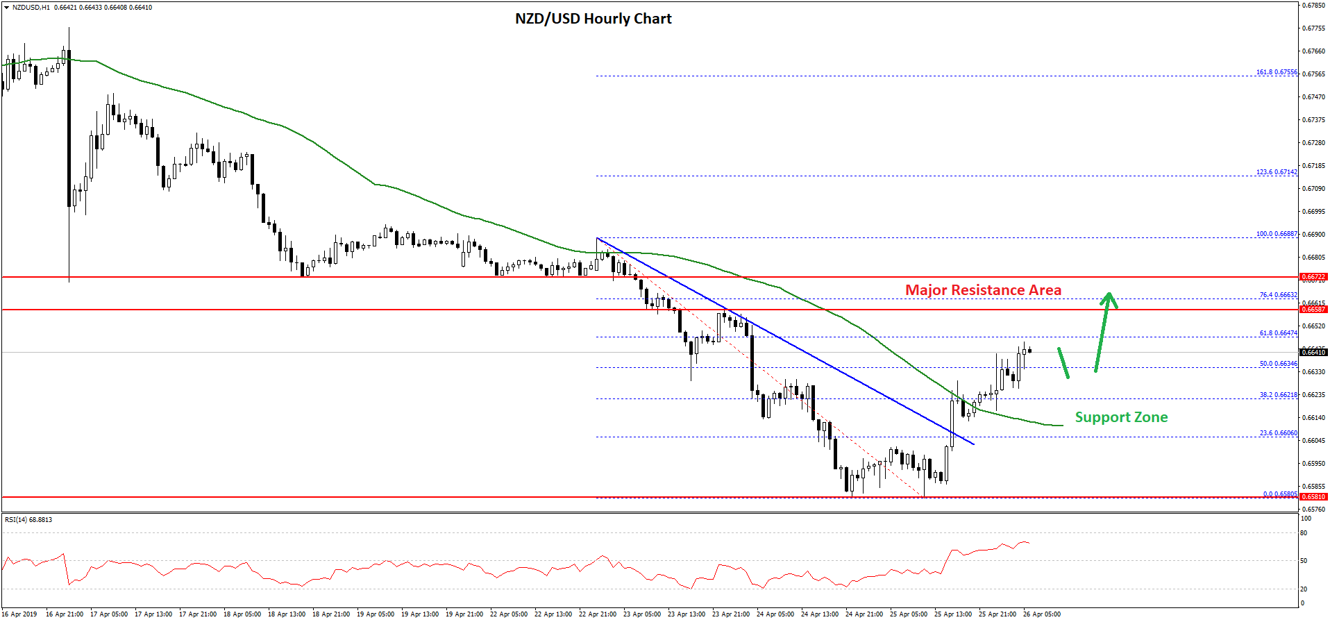 A swing low was formed at 0.6580 and recently the pair climbed above the 0.6600 level. There was a break above a key bearish trend line with resistance at 0.6605 on the hourly chart.