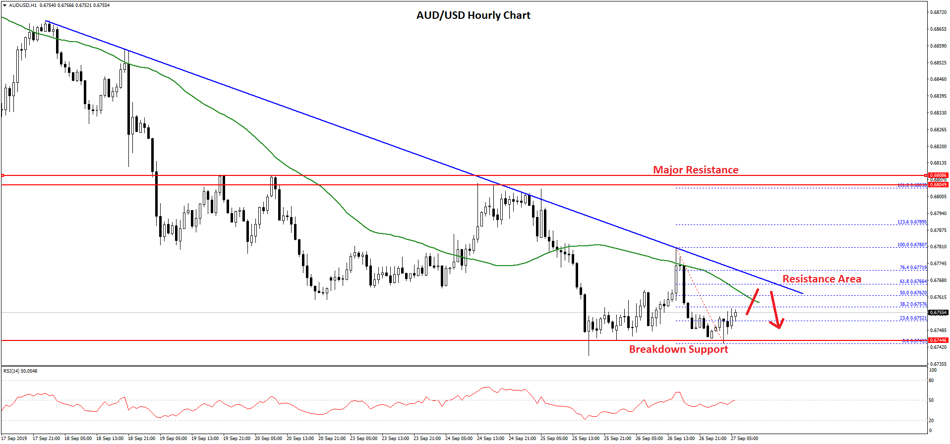 - There is a major bearish trend line forming with resistance near 0.6765 on the hourly chart of AUD/USD.