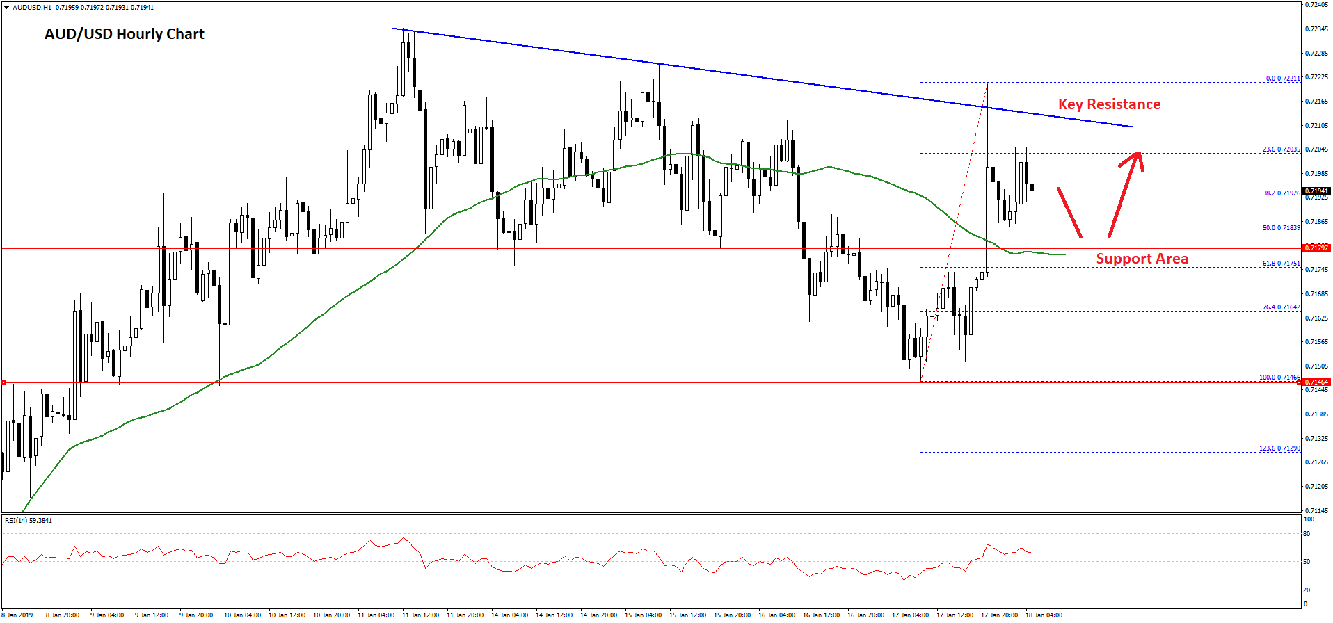On the upside, there is a crucial resistance near 0.7200 and a major bearish trend line in place with resistance at 0.7210 on the hourly chart of AUD/USD. A close above 0.7210 and 0.7220 is needed for more gains in the near term. If not, the pair may slide back towards 0.7140.