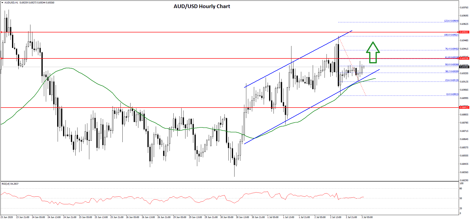 Moreover, it seems like there is a key rising channel forming with support near 0.6920 on the hourly chart of AUD/USD. On the upside, an initial hurdle is near the 0.6950 level, above which the bulls are likely to aim a break towards the 0.7000 resistance.