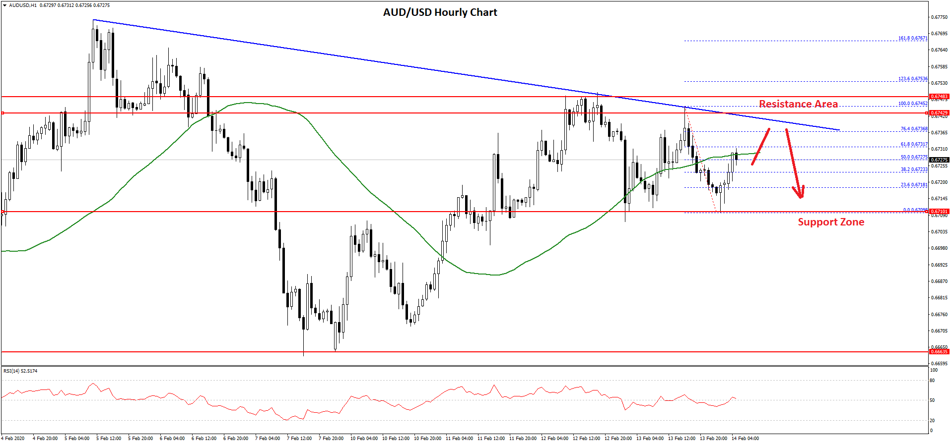 - There is a major bearish trend line forming with resistance near 0.6740 on the hourly chart of AUD/USD.