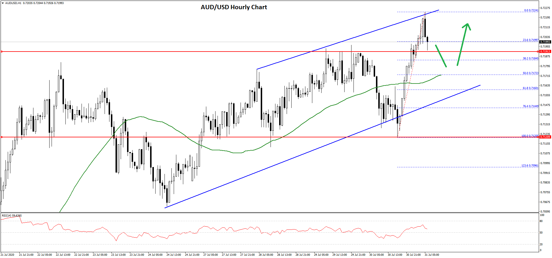 The pair even managed to clear the 0.7200 resistance zone and it settled nicely above the 50 hourly simple moving average. It traded as high as 0.0.7224 on FXOpen and it is currently correcting gains.