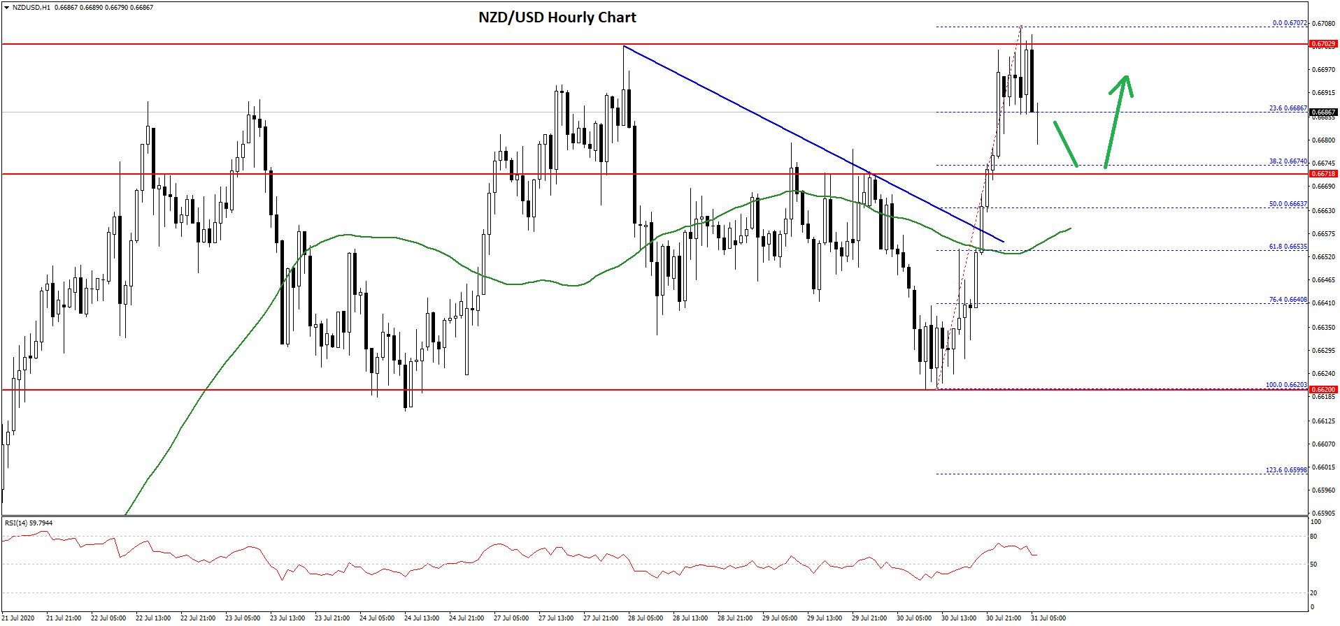During the rise, there was a break above a connecting bearish trend line with resistance near 0.6655 on the hourly chart of NZD/USD. The pair even climbed above the 0.6700 level and settled well above the 50 hourly simple moving average.