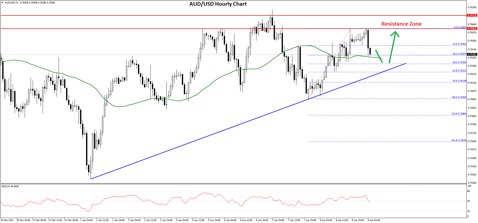 - There is a key bullish trend line forming with support near 0.7630 on the hourly chart of AUD/USD.