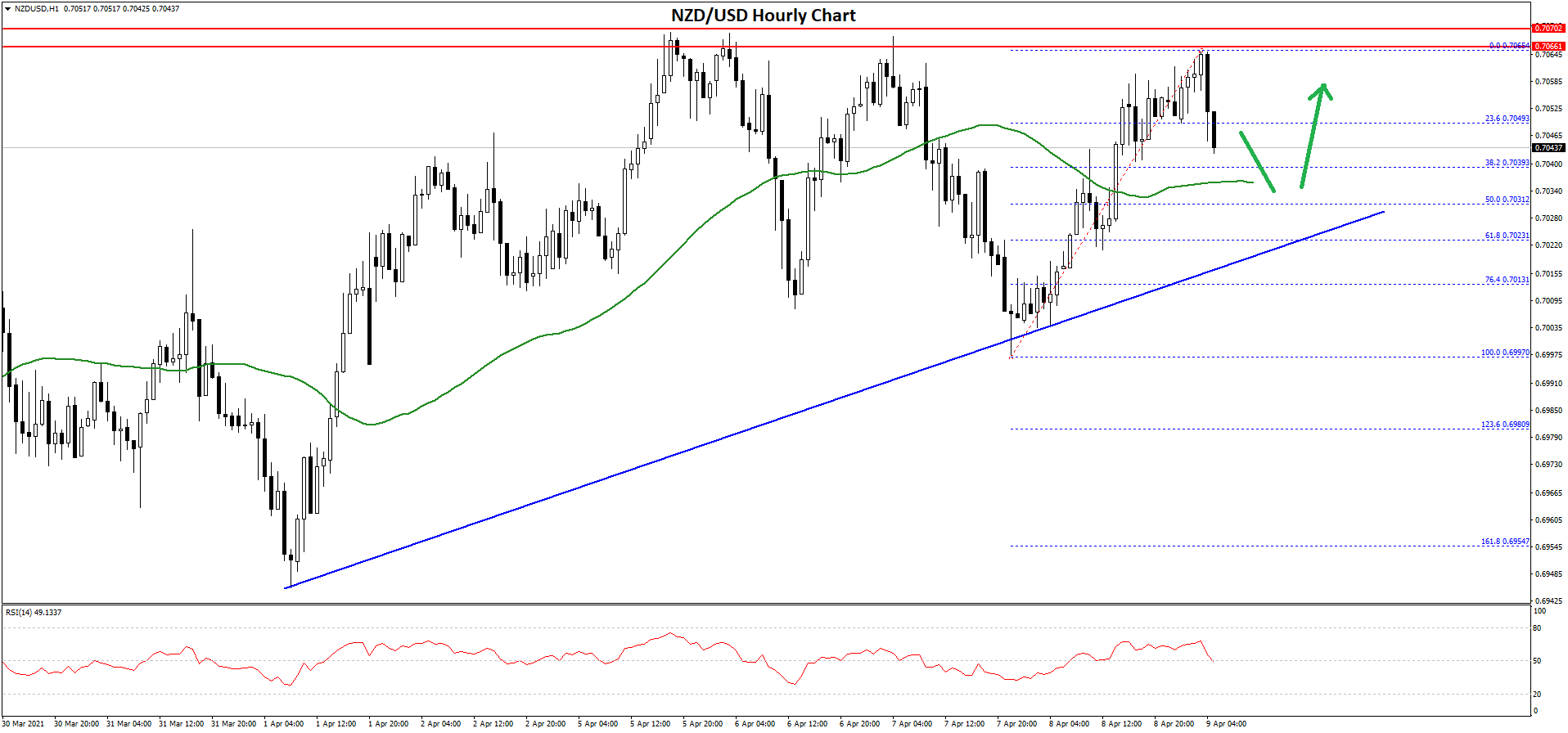 - There is a major bullish trend line forming with support near 0.7025 on the hourly chart of NZD/USD.