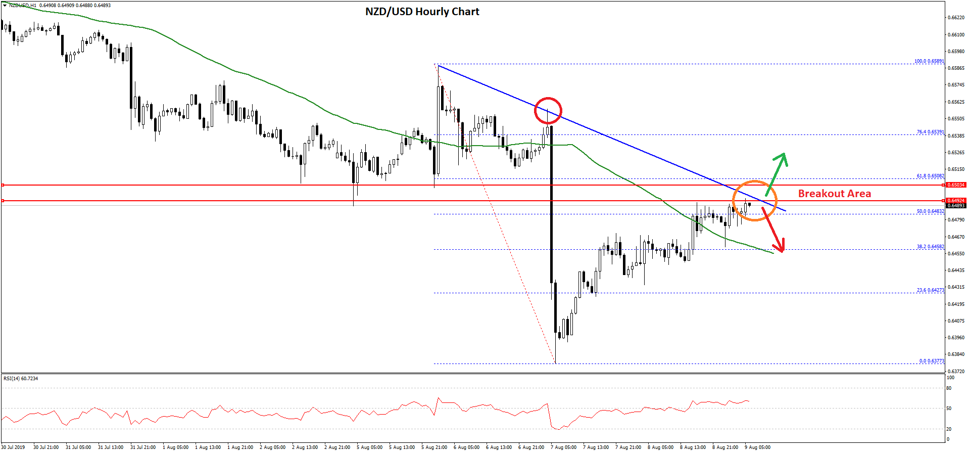 - There is a major bearish trend line forming with resistance near 0.6500 on the hourly chart.