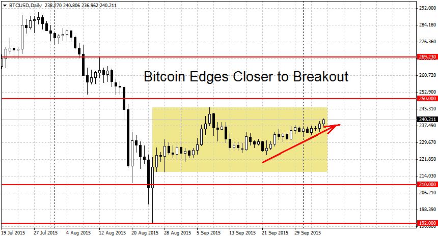 Bitcoin is edging closer to an upside breakout. The bulls have managed to string together several days of gains, pushing BTC almost 2 percent higher. The chart below shows the slow moving but steady march higher since September 22nd.