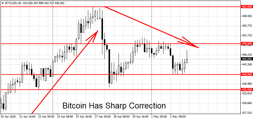 The upward momentum is gone but the trend is still up. To regain the lost momentum, the bulls will have to make a break above the $462 dollars swing high. As we’ve mentioned in previous articles we have a major resistance area from $461-$465 on Fxopen and $470-$475 on other exchanges. A decisive breakout above this important area may spark a run for the $500 round figure. This was last year’s high for BTC/USD. A break of this important level could intensify the gains.