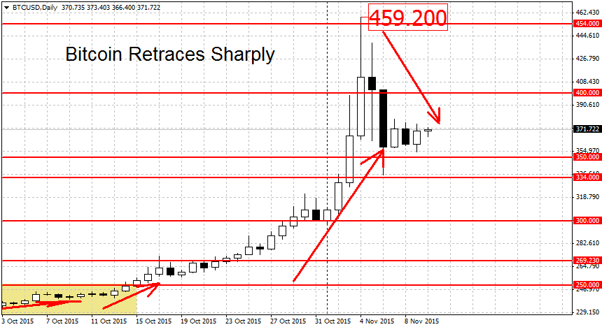 Bitcoin retraced sharply after reaching new 13-month highs last Wednesday. The fall took us briefly to $336.22 but prices didn’t stay low for long and soon BTC/USD stabilized above the $350 handle. One coin is selling for $371.72 dollars at the moment. Last week we warned our readers that the parabolic gains are likely not sustainable: