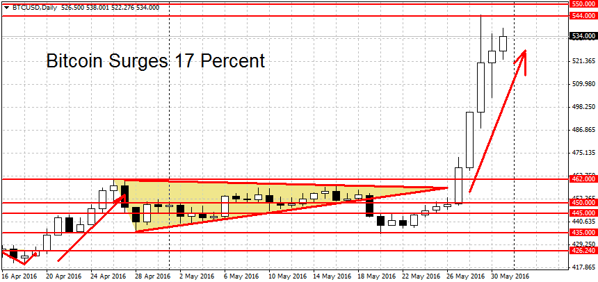 Everyone’s favorite cryptocurrency surged 17 percent in the past few days alone. After clearing the important $462 – $465 resistance level (noted HERE), BTC hit $495 by Saturday and $544.58 on Sunday. The $465 resistance help up prices for the past few months, so it’s not a surprise that bitcoin went out of control once the level was finally broken. As expected, a similar spike happened on a break of $500, last year’s high for BTC/USD on most exchanges.