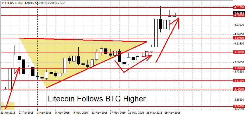 After lingering below the recent highs for almost a month, Bitcoin finally broke the $465 resistance level on Friday. In the next two days, the $500 round figure gave way as well, marking a high of $544 on Sunday. Litecoin faithfully following BTC so far is up by 11.5 percent since Friday.