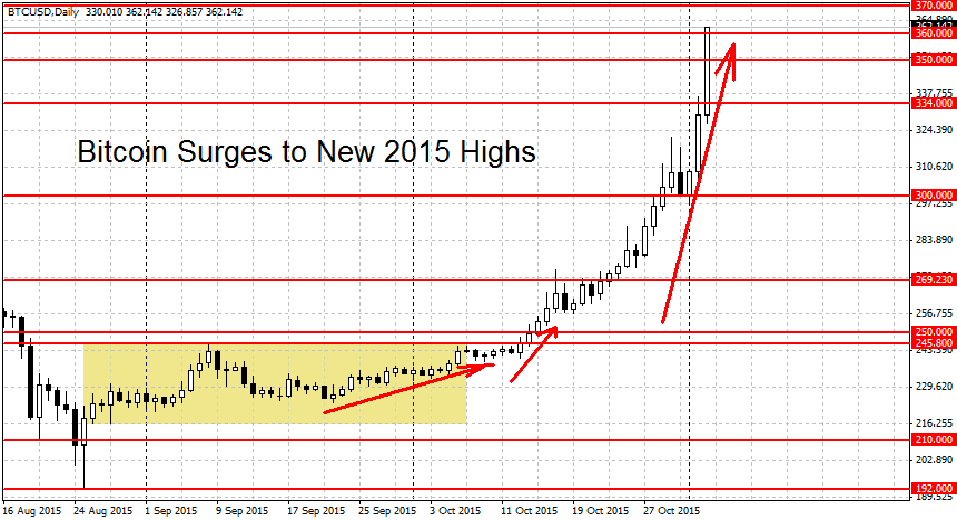 Bitcoin gained $78 dollars or 27% since last Tuesday. But the gains from the start of the rally near $250 are even larger, at $108 dollars or a massive 43.2 percent. On the chart below we can see that in the last two days the BTC/USD has gone parabolic. Yesterday we closed higher by $21 dollars and today we’re up by $33 dollars and it’s only lunchtime.