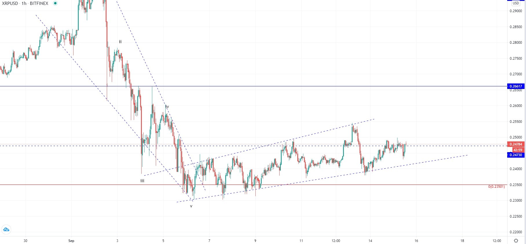 Looking at the hourly chart, you can see that from last week an ascending channel was formed in which the price bounced and made higher high and lower lows. Unlike in the case of Bitcoin where we have seen a clear impulsive move, the price action of Ripple has shown a more steady pattern. This could indicate that the recovery seen from last week is still corrective in nature and we are to see further lows after it ends. In that case, it would indicate that the correction for the higher degree and started on the 2nd of August hasn’t ended.