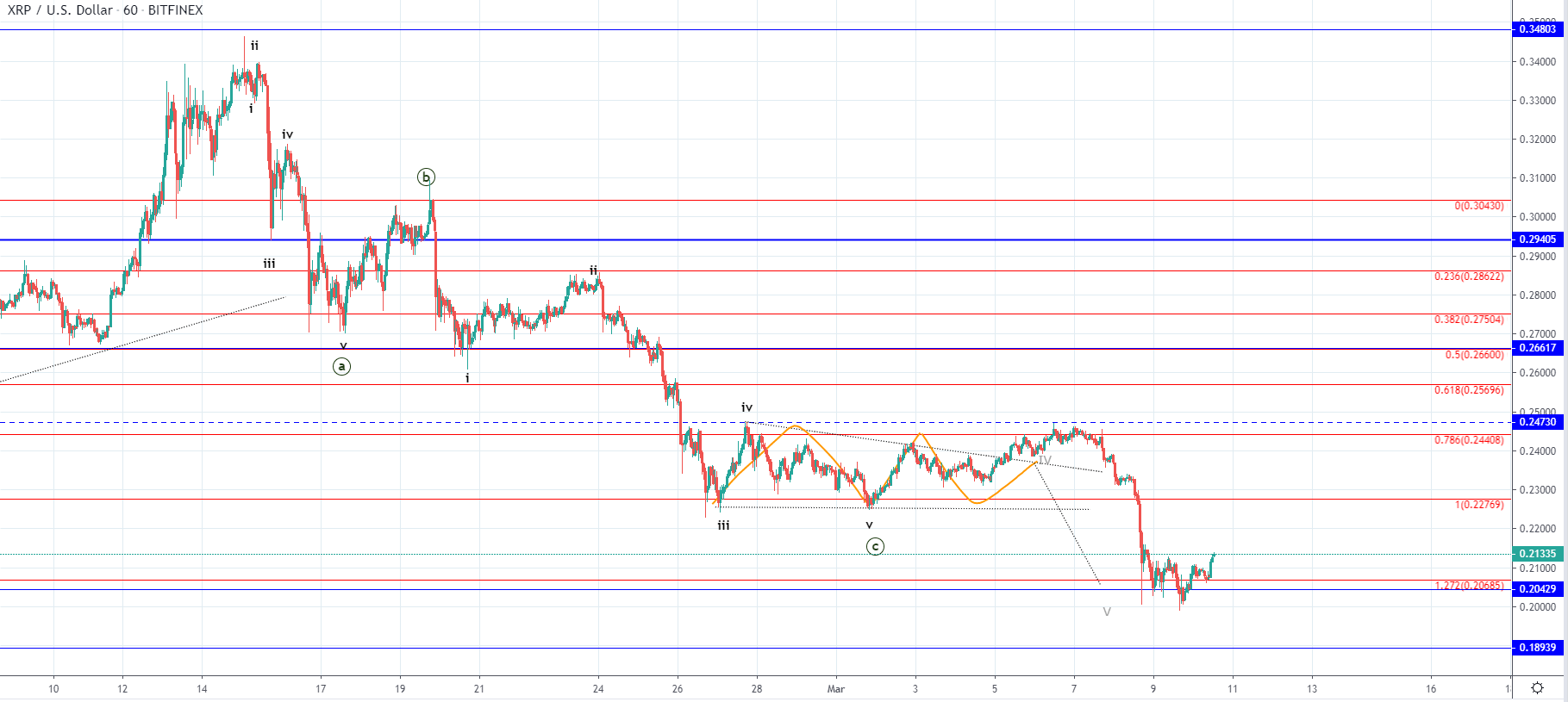 On the hourly chart, we can see that the price came down to my projected target for the main scenario in which the price of Ripple was to end it’s 5th wave out of the five-wave impulse to the downside of a lower degree which is the C wave of the Minute count. An interaction has been made with the 0.2 horizontal level and even a quick dip below it was made but only served to activate the buying as it entered the buyer’s territory.