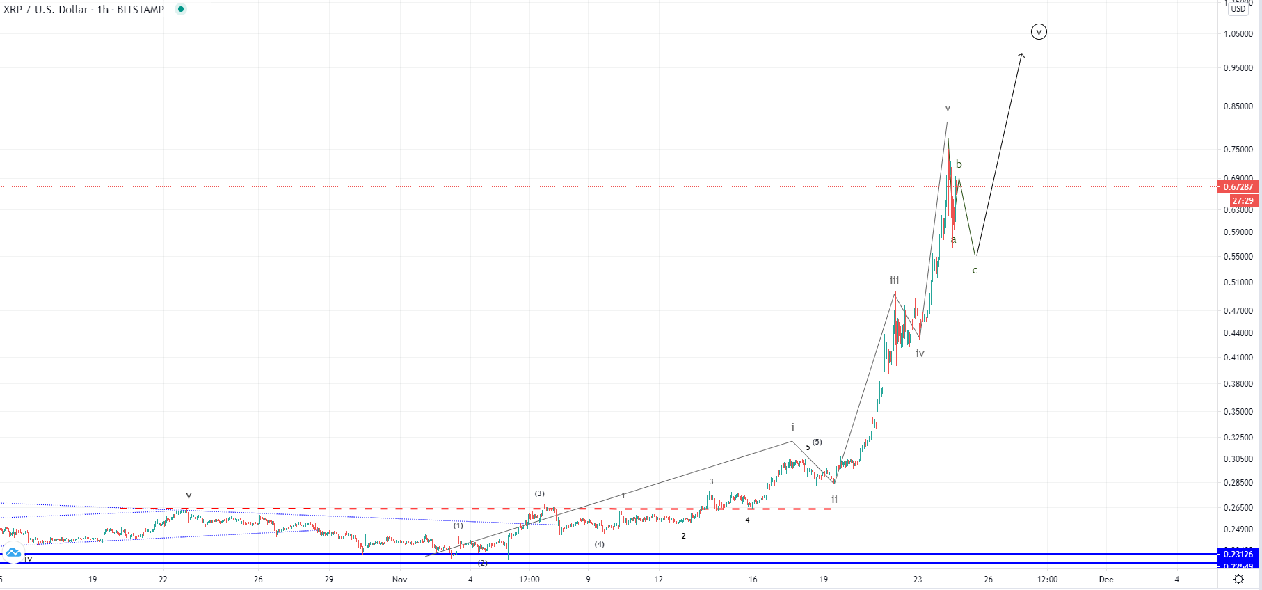 If this is true, then the current correction is its 4th wave and is set to push back the price for another establishment of support before the final wave is to complete. For now, the $0.55 area looks like it might be where the correction ends but we are yet to see how it develops. After the current pullback, further price growth would be expected to the vicinity of the $1 level which is a psychologically significant number.