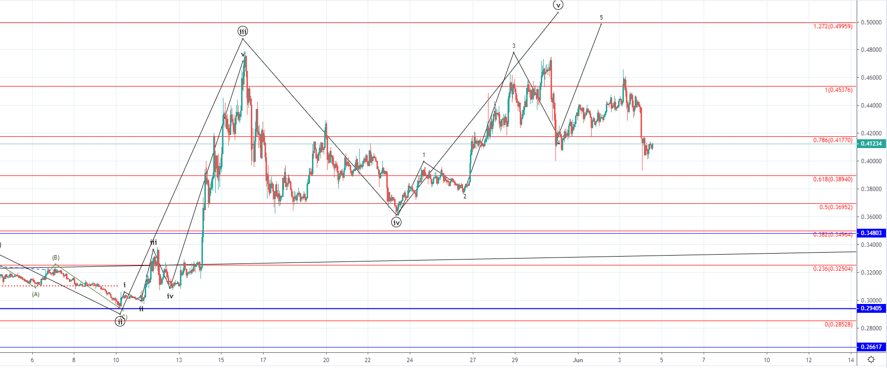 The most significant support level would be around $0.348 at 0.382 Fibonacci level which served as significant resistance on the way up, so if the price is to pullback for an establishment of support interaction with the mentioned level would be awaited.