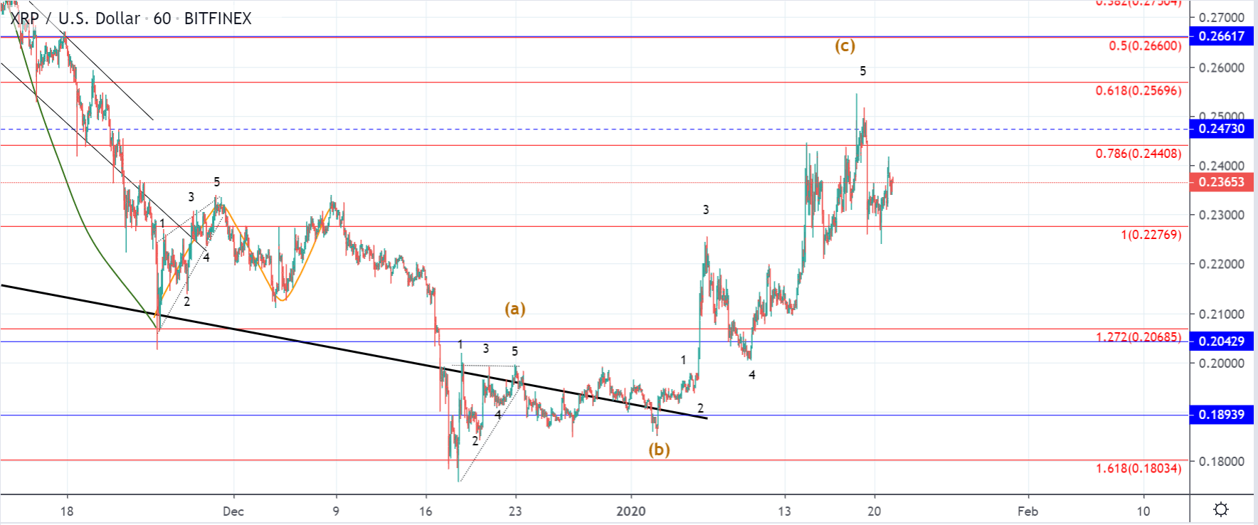 On the hourly chart, you can see the since the interaction with the $0.18939 horizontal support level we have seen an exponential increase in a parabolic manner for the price of Ripple of around 34%. Considering the amount of the price increase we could have seen the completion of the five-wave move to the upside but it is still unclear which structure it belongs to.