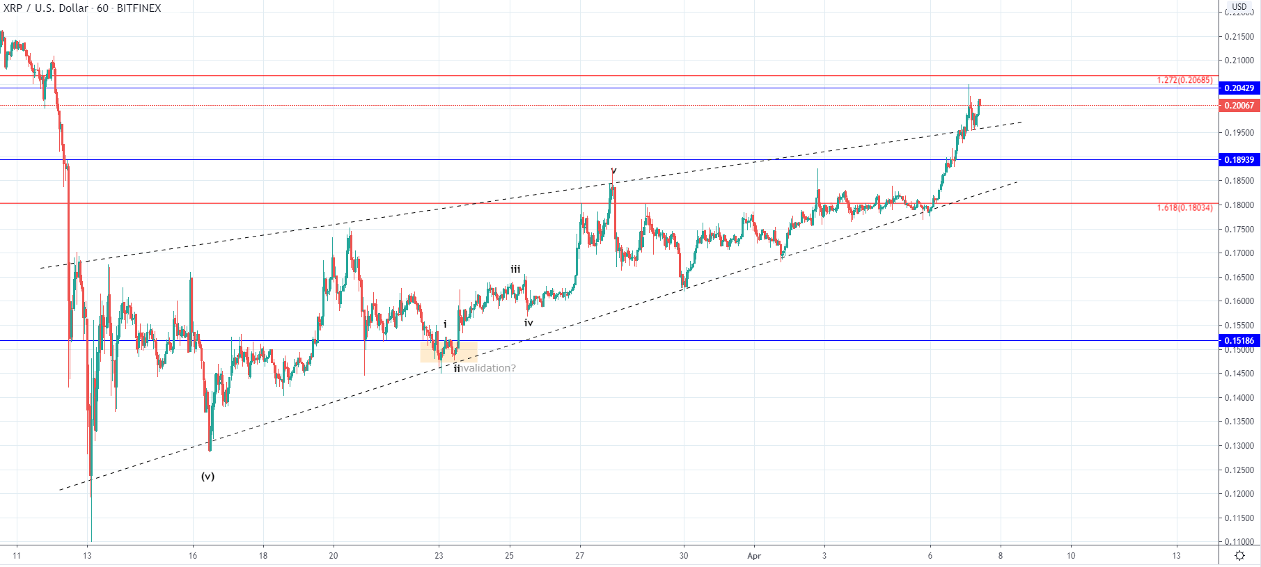 On the hourly chart, we can see that interaction has been made with the horizontal resistance at $0.204 but only as a quick spike. The price is now looking to continue increasing but it encountered strong resistance slightly below the 1.272 Fib level which can also be retested before the end of this increase. A breakout has been seen from the ascending structure unlike in the case of Bitcoin but this is still unconfirmed trendline which is why we can’t say conclusively.