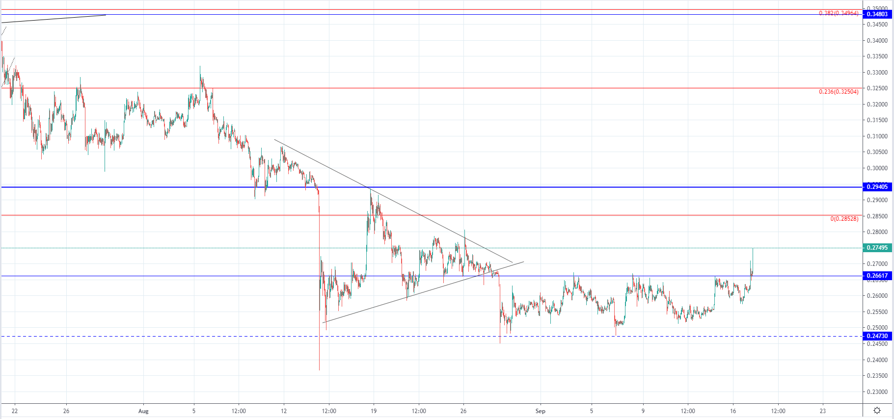 On the hourly chart, you can see that the momentum behind the increase looks strong and with the price breaking its significant horizontal resistance. The price increase is likely to continue for a bit more until it reaches its upper horizontal resistance around the $0.27843 or the next one at $0.29405. After the increase ends I would be expecting a retracement back to the broken horizontal resistance as a retest of support and if the price manages to hold above it, it could indicate the start of the recovery. But if the price fails to hold above it and instead enters the lower range it would more likely mean that the increase seen was corrective and that the downtrend would continue for another lower low before a recovery can be made.