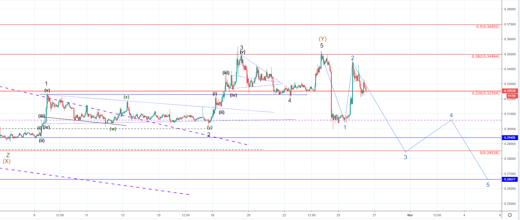 Looking at the hourly chart, you can see that from yesterday’s low the price increased again with strong momentum of around 12.77% to the upside and came to $0.34362 at its highest point yesterday. But another descending structure started forming and the price is currently searching for support at around 0.236 Fibonacci level.